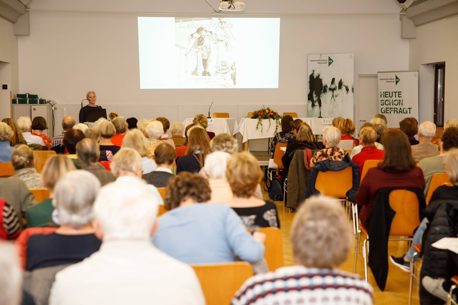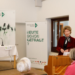 Am 15.11.2019 hat im Pfarrzentrum der Pfarre Graz-St. Leonhard die 11. Tagung „Hochaltrigsein als Herausforderung“ stattgefunden. Zu Beginn begrüßte Waltraud Salzger im Namen des Arbeitskreises „Umfassender Schutz des Lebens – aktion leben Steiermark“ die TeilnehmerInnen der Tagung. Danach folgten Grußworte von Pfarrer Hans Schrei, von Andrea Ederer (Präsidentin der Katholischen Aktion Steiermark) und von Gemeinderätin Sissi Potzinger, die die Grußworte des Bürgermeisters Siegfried Nagl überbrachte. Die Einleitung zum Thema wurde von Frau Edith Gruber gestaltet, die langjährig als Künstlerin an der Oper Graz und als Korrepetitorin an der Kunstuniversität tätig war. Mit drei Gesangseinlagen und einigen Worten zur Lebensfreude im hohen Alter gelang ein berührender und sehr persönlicher Einstieg zum Thema. Frau Carina Schweiger, die als Co-Leiterin im Gerontopsychiatrischen Zentrum Graz arbeitet, berichtete in ihrem Vortrag zu Beginn von „Zentralen Kategorien eines guten Lebens im Alter“. Dabei wurden folgende Kategorien benannt: Selbständigkeit, Selbstverantwortung, Selbstaktualisierung, Mitverantwortung und bewusst angenommene Abhängigkeit (Quelle: Prof. Dr. phil. Dipl.-Psych. Andreas Kruse, Institut für Gerontologie an der Ruprecht-Karls-Universität Heidelberg 2005). Im Weiteren wurden von ihr jene Angebote und Unterstützungsmöglichkeiten erläutert, die jenen Menschen zur Verfügung stehen, die mit einem geringen Einkommen leben müssen. Frau Barbara Fleck, die in der mobilen Sozialbetreuung von alten Menschen selbstständig tätig ist, erläuterte die Lebensfreude als äußerst individuell, dabei wurden verschiedene Zugänge aufgezeigt und viele Bereiche benannt, die zur Lebensfreude beitragen können. Vor allem die Bedeutung des Alltäglichen, das bewusst wahrgenommen wird, wurde als ein wichtiger Zugang zur Lebensfreude benannt. „Lebensfreude zu empfinden bedeutet für mich, die vielen kleinen besonderen Momente im Leben zu erkennen und daraus Kraft zu schöpfen“ (B. Fleck). In der Pause konnten sich die etwa 120 TagungsteilnehmerInnen beim Pausenempfang, zu dem der  Grazer Bürgermeister Siegfried Nagl eingeladen hatte, stärken. Des Weiteren haben sich bei einem „Marktplatz“ zehn Institutionen mit Angeboten für ältere und hochaltrige Menschen vorgestellt. Ein Büchertisch von der Buchhandlung Moser rundete das Angebot ab. In der abschließenden Podiumsdiskussion wurden noch persönliche Anliegen und Anfragen zum Thema eingebracht. Frau Karin Oblak, Beraterin und Erwachsenenbildnerin, moderierte die Tagung sehr umsichtig. Die abschließenden Dankesworte sprach Elisabeth Kapper-Weidinger, die als ehrenamtliche Vorsitzende im Arbeitskreis tätig ist. Des Weiteren informierte sie alle Anwesenden über den Termin der nächsten Hochaltrigentagung am 6.November 2020.
