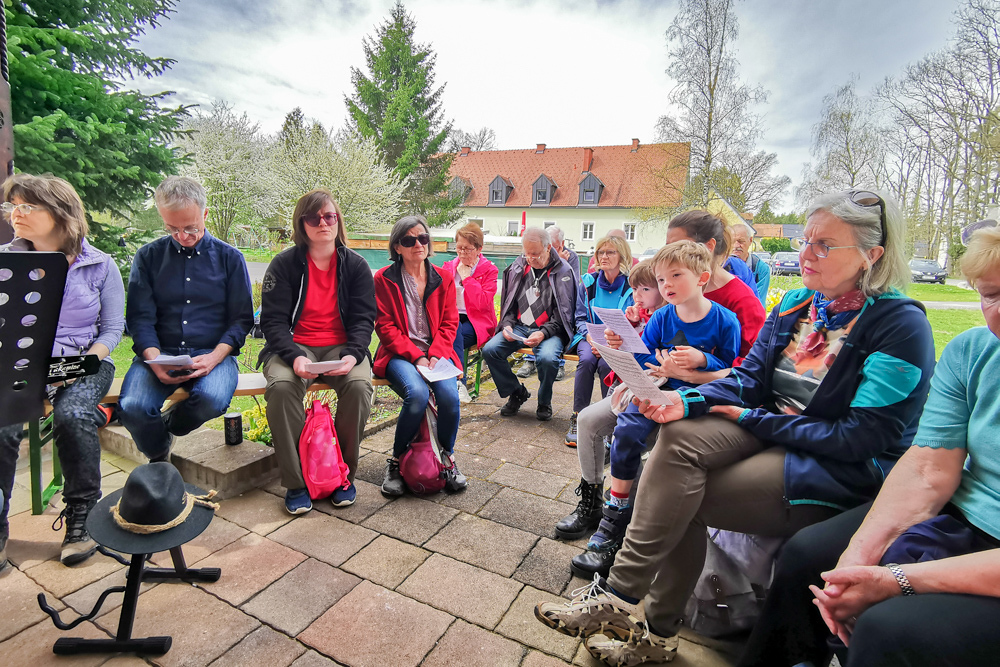 Das Ziel des Tages war die Marienkapelle im Kaiserwald. Dort feierten wir um etwas nach 11:00 Uhr einen Gottesdienst und ließen den wunderbaren Vormittag anschließend bei herrlichem Wetter und einer kleinen Agape ausklingen.